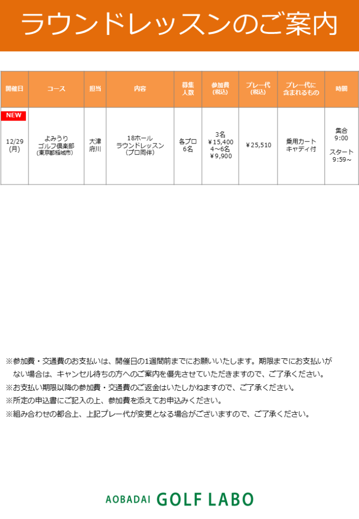 トップページ > ニュース > ニュース > イベント募集 > ラウンドレッスン募集 > 12月ラウンドレッスン参加者募集中!!