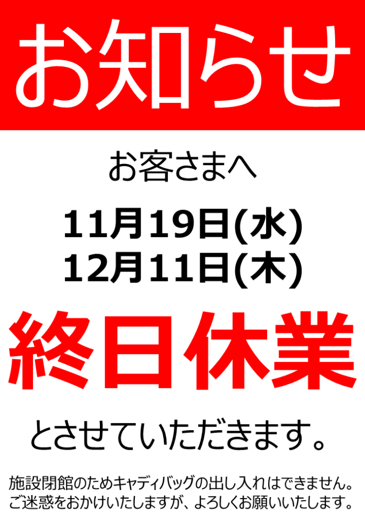 トップページ > ニュース > ニュース > お知らせ > 終日休業のお知らせ