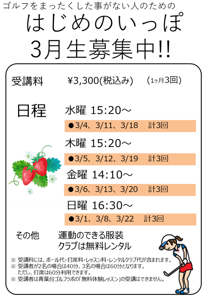ゴルフを始めたい方の応援レッスン企画・はじめのいっぽ 3月生募集開始です!!