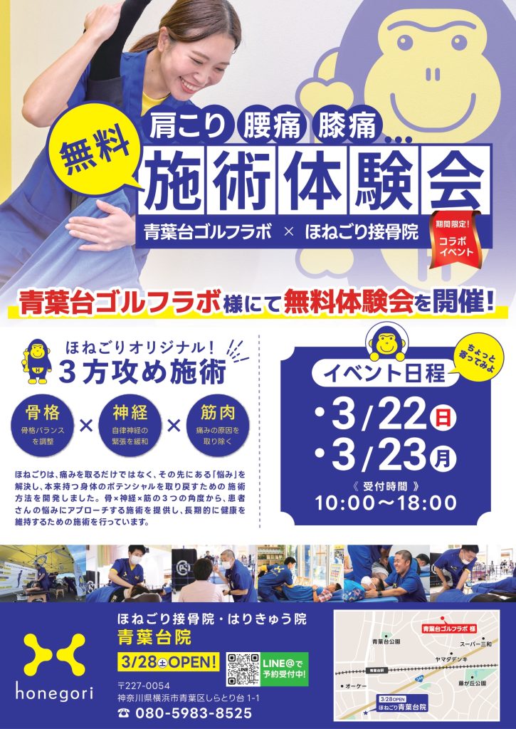 3/22(日)・3/23(月)ほねごり整骨院×青葉台ゴルフラボイベント!無料施術体験会をラボにて開催【一般の方の受付も可能です】